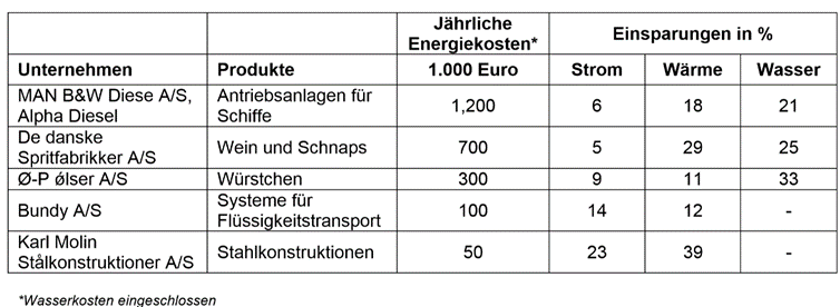 Beispiele für Energieeinsparungen durch Einführung eines Energiemanagementsystems, Dänemark; Quelle: UBA, Energiemanagement als Erfolgsfaktor, November 2010