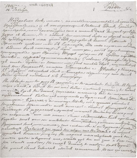 Письмо к родителям И. А. и П. Н. Толстым из действующей армии 28 декабря 1812 г. Автограф