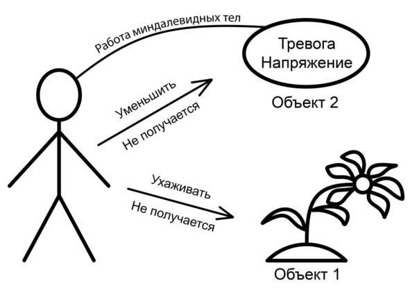 В случае, когда первичное нулевое действие не нейтрализовалось, возникает эмоционально-телесная реакция (следствие работы миндалевидных тел), что часто воспринимается нашим мозгом как еще один объект. К нему подобным образом формируется действие (здесь «уменьшить»), нередко нулевое.