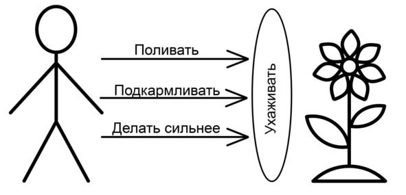 Часто мы воспринимаем контакт с цветком как единое действие, но на самом деле в его структуре, как здесь – «ухаживать за цветком», склеиваются между собой: «поливать», «удобрять», «делать сильным». Последнее действие является нулевым.