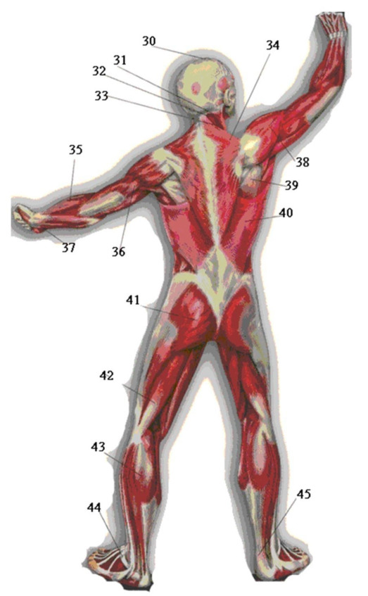 Ремённая мышца головы и шеи (32) и мышца, выпрямляющая позвоночник – Сокращение мышцы на обеих сторонах производит разгибание позвоночного столба с одновременным движением рёбер, ребра среднего отдела грудной клетки сближаются, обуславливая расширение заднего отдела грудной клетки и тем самым способствуя вдоху. Сокращение мышцы на одной стороне способствует наклону позвоночного столба в сторону. Одна из важнейших мышц для правильной осанки, защищает позвоночник от ударов, активно участвует при отрыве руки противника на положения рычага локтя.
