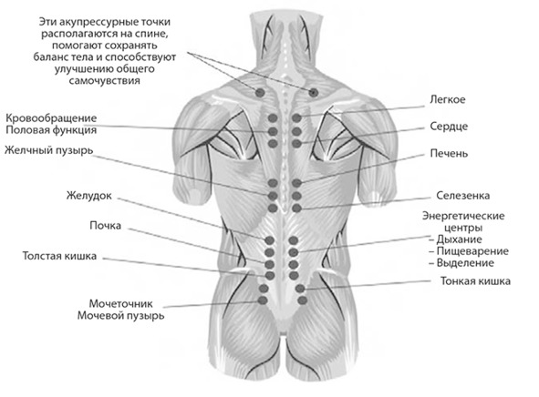 Рис.10. Активные зоны вдоль позвоночного столба при самомассаже помогают сохранять баланс тела и улучшают общее самочувствие
