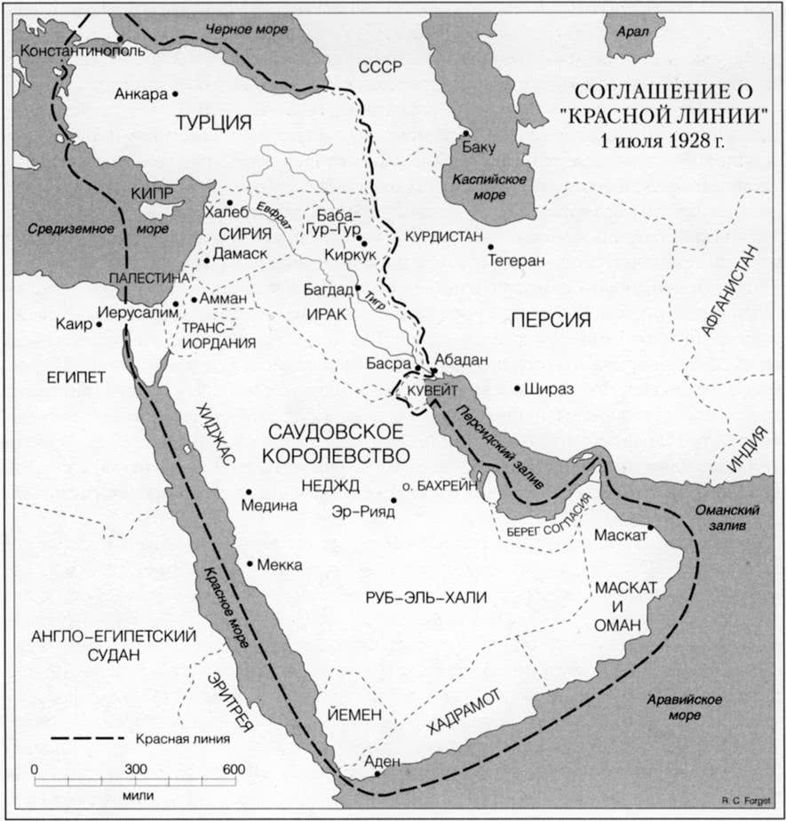 Оставался открытым вопрос, связанный с «пунктом о самоограничении», по которому все участники соглашались работать в регионе совместно, и только совместно. Как рассказывал позднее Гюльбенкян, на одной из последних встреч он послал за большой картой Ближнего Востока, взял толстый красный карандаш и начертил линию вдоль границ не существовавшей уже Оттоманской империи. «Это была старая Оттоманская империя, какой я ее знал в 1914 г., – сказал он, – и я должен был ее знать. Я родился в ней, жил в ней и служил ей». Однако он разрисовал то, что уже и так было решено. Несколькими месяцами ранее Великобритания, используя карты министерства иностранных дел, и Франция при помощи карт из Кэ д'Орсэ[173] уже отметили те же самые границы. Кто бы ни был автором, это важное согласование назвали впоследствии Соглашением о красной линии. Внутри этой красной границы оказались все основные месторождения нефти на Ближнем Востоке, за исключением тех, что были в Персии и Кувейте. Партнеры обязались не участвовать в операциях с нефтью на этой огромной территории иначе, как в сотрудничестве с остальными учредителями Turkish Petroleum Company. Таким образом, пункт о самоограничении из соглашения, заключенного министерством иностранных дел Великобритании в 1914 г., был через 14 лет воспроизведен в виде Соглашения о красной линии. Оно создало основы будущей разработки нефтяных месторождений на Ближнем Востоке и потом на десятилетия оказалось в центре ожесточенного конфликта.