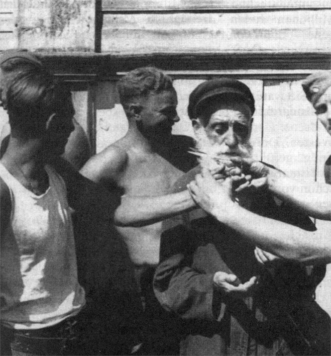 Немецкие солдаты издеваются над стариком-евреем. Западная Украина, июль 1941 года