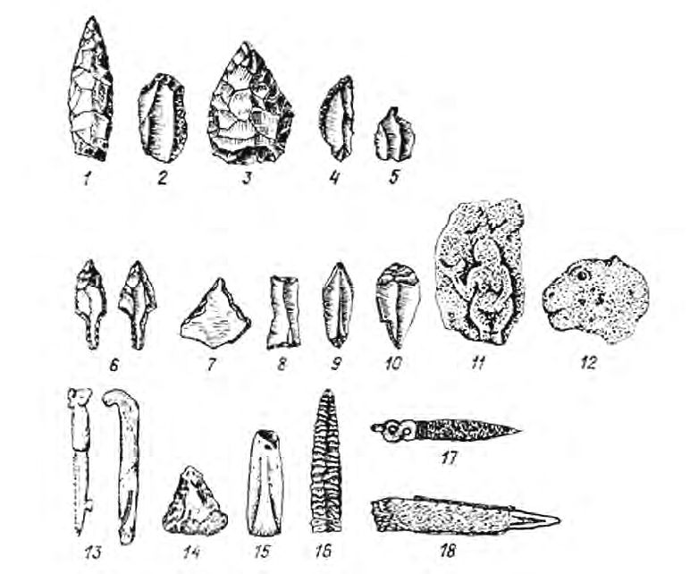 Рис. 1.7. Каменные изделия первобытного человека. Верхний ряд: листовидное острие (1), скребок (2), рубило (3), нож с обушком (4), проколка (5) (мустьерская эпоха). Средний ряд: наконечники с черенком (6), сверло (7), резцы (8, 9), скребок-резец (10), рельеф на камне (11), голова львицы (12) верхний палеолит). Нижний ряд: кремневые серпы в оправе из кости и рога (13), мотыга каменная (14), сланцевое тесло (15), наконечник стрелы (16), нож ритуальный из кремня (17), кинжал с кремневыми вкладышами (18) (неолит) [1]