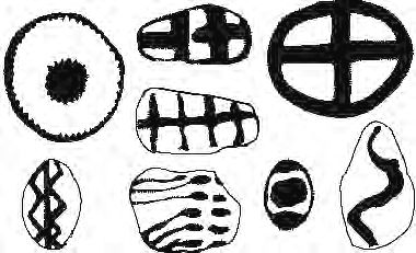 Рис. 1.9. Разрисованные гальки с «символическими» узорами. (Из пещеры Мас-д, Азиль) [2]