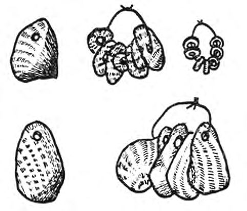 Удивляться есть чему. Размеры отверстий очень разнообразны. В ювелирных украшениях они делались настолько малыми, что туда могла пройти только нить. Отверстия малых диаметров сверлились не только в раковинах (см. рис. 1.10), янтаре, но и в чрезвычайно твердых – агате, халцедоне, яшме. Длина отверстия нередко превышала диаметр в десятки раз. Не исключено, что здесь в качестве наконечника сверла использовался корунд или даже алмаз.