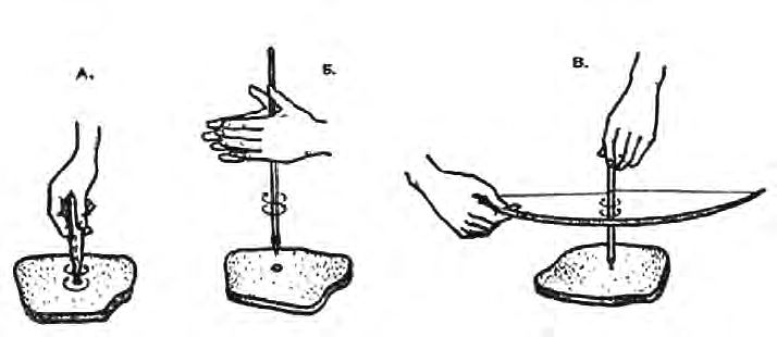 Прабабушкой сегодняшней дрели была небольшая палочка-стержень, на конце которой закреплялся каменный наконечник. Сверление производилось перекатыванием ее между ладонями (см. рис. 1.14, б). По сравнению с одноручным способом сверления скорость возросла до 12 об/с. Однако большого давления на стержень (свыше 50 Н) на сверло этим методом достичь было невозможно, так как палочка при вращении скользила по ладоням.