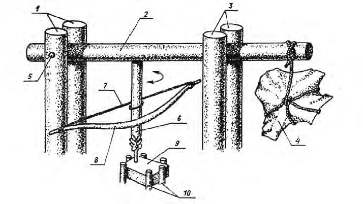 Рис. 1.15. Первобытный станок для цилиндрического сверления каменных топоров. 1 – стойки-колонны, 2 – рычаг, 3 – направляющие, 4 – пригруз (камень), 5 – ось, 6 – вал-шпиндель, 7 – тетива лучка, 8 – лучок, 9 – каменный топор, 10 – колышки для закрепления топора [22]