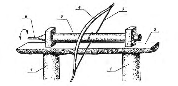 Рис. 1.16. Первобытный сверлильно-токарный станок для цилиндрического сверления каменных пронизок (эксперимент). 1 – стойки-колонны, 2 – станина (основание), 3 – тетива лучка, 4 – лучок, 5 – вал, 6 – шпиндель [22].