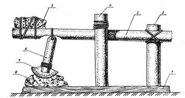 Рис. 1.17. Первобытный камнераспилочный станок (реконструкция). 1 – фундаментная доска, 2 – стойка-колонна, 3 – горизонтальная балка, 4 – вертикальные направляющие балки, 5 – пригруз (камень), 6 – качающаяся деревянная подвеска, 7 – рабочий инструмент (пластина кремня), 8 – распиливаемый камень [22]