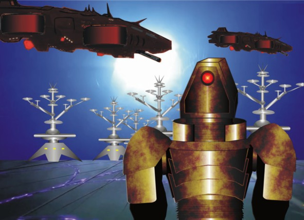 – Робот же, услышав своё имя, повернул к нам свою голову, под его прозрачным забралом можно было рассмотреть четыре, похожих на выпуклые линзы, следящих устройства, и заговорил: