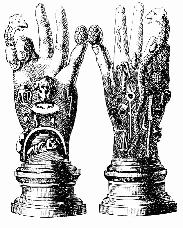 Эмблема руки мистерий из книги Монфакона “Древности”