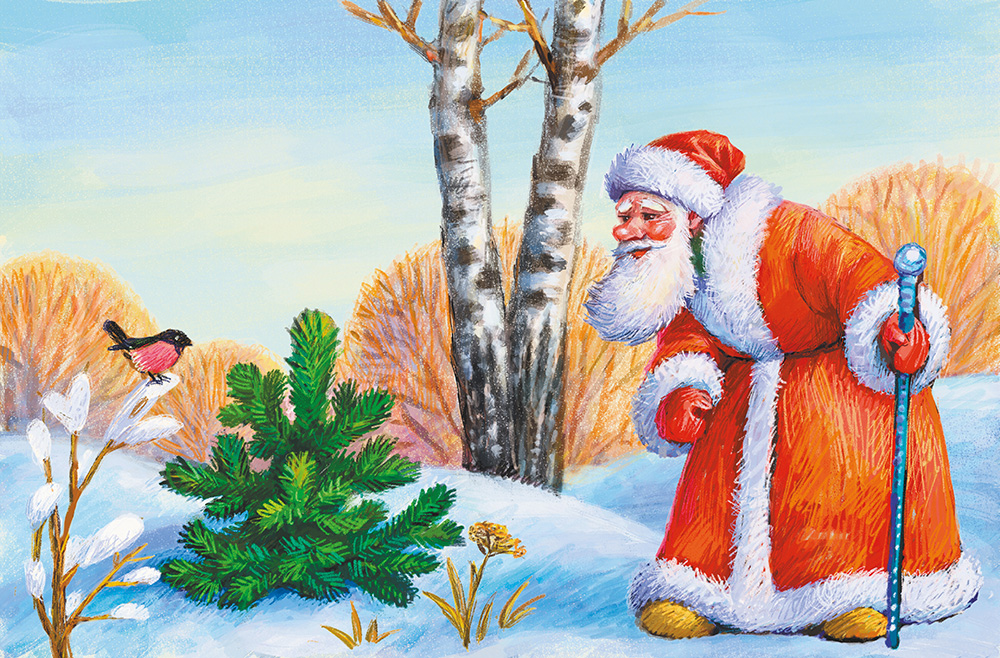 Обошёл Дед Мороз весь лес, выбрал для ребят самую большую, красивую и пушистую ёлку, что росла на лесной опушке, сел в свои сани и уехал с ней на праздник.