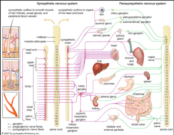 Fig. 1. Physiology of the autonomic nervous system: as we see, the work of the sympathetic nervous system mobilizes the body, and parasympathetic brings it back to calmness and helps to store energy.
