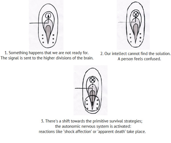 There’s a shift towards the primitive survival strategies; the autonomic nervous system is activated: reactions like “shock affection” or “apparent death” take place.