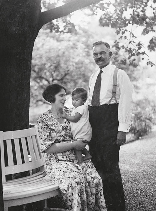 Mutter Irma Ernst-Brunner und Vater Robert Ernst mit dem einjährigen Richard im Garten ihres Hauses in Winterthur, um 1934.