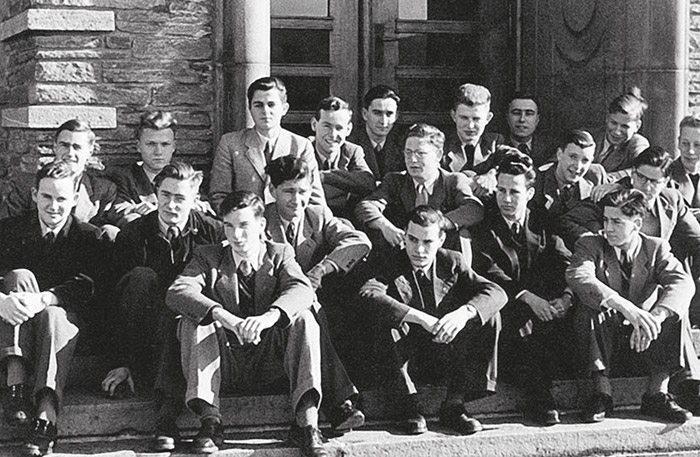 Die Oberrealklasse der Kantonsschule Im Lee von Lehrer Hans Läuchli (4. Reihe, 1. v. r.), 1951. Richard Ernst (2. Reihe, 3. v. l.) sitzt neben seinem Schulfreund Werner Hablützel (1. Reihe, 1. v. l.).