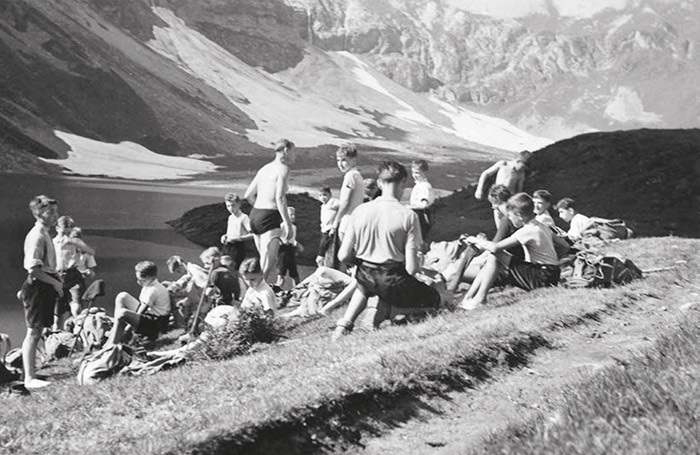 Ausflug mit den Kadetten Winterthur in die Schweizer Alpen, um 1946. Richard Ernst war als Jugendlicher einige Jahre Mitglied der Kadetten, der Jugendorganisation der Schweizer Armee.