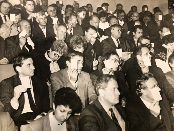 Это ведь всё проявления одного и того же – чувства справедливости и необходимости поступать так, как дОлжно. К примеру, папа никогда не был диссидентом, но и в партию вступать не стал. Это в его оборонном институте, безусловно, стоило ему карьеры (так же как и то, что он не был военным). Но так было правильно. Ниже – очень дорогая мне фотография, сделанная на неведомо каком собрании, где все голосуют «за» и только папа, сжав зубы, не голосует.