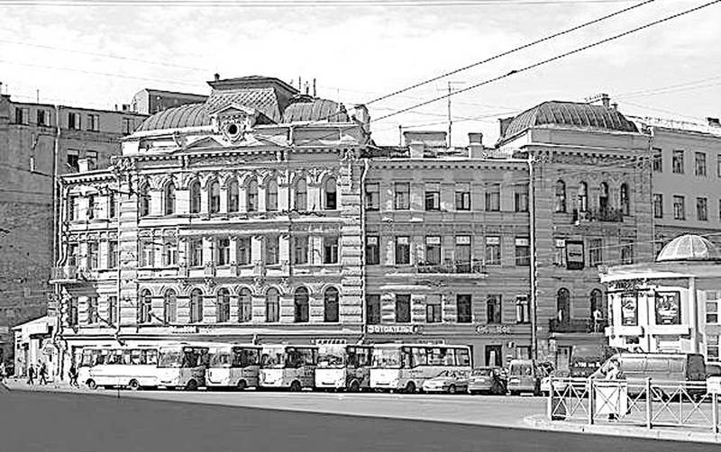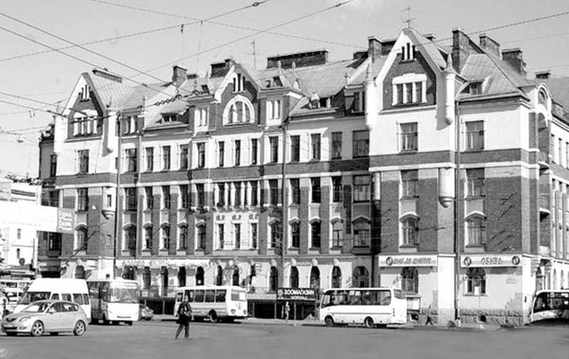 Вторая часть площади оформилась, как единое архитектурное пространство, тоже в 1950-е гг. Хотя дом, выходящий полукругом в Финский переулок, Павел Сюзор построил в 1878 г. До нашего времени он дошел в надстроенном виде и частично, с южной стороны, разрушенным. И это жаль, поскольку здание, представляющее собой характерный образец эклектического стиля, весьма красиво. Зато совсем не жаль, что в 2013 г. в Финском переулке снесли Чмонинские бараки. Так местные жители прозвали торговые постройки, возведенные в начале XXI столетия архитектором Глебом Чмониным посередине переулка, превращенного в пешеходную зону.