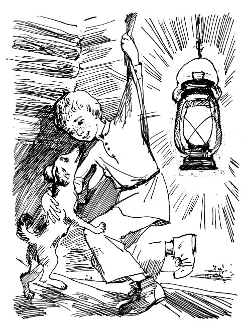Не теряя времени, он, осторожно, держась зубами за изгаженную вожжу, обвязывает свободным её концом Жучку, затем поспешно карабкается наверх.