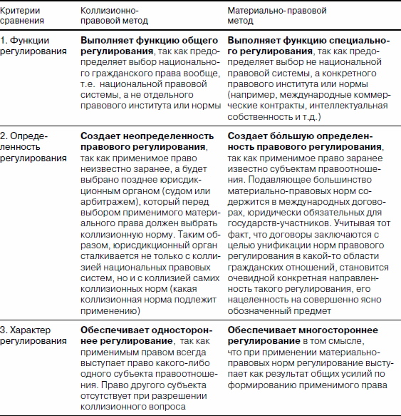 Сравнительная характеристика коллизионно-правового и материально-правового методов регулирования в МЧП представлена в табл. 1.
