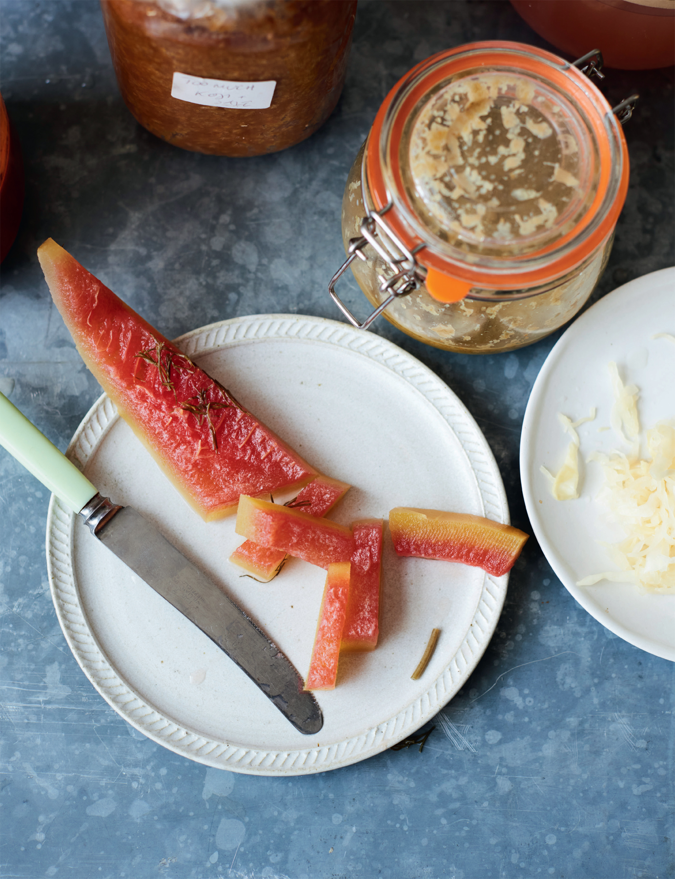 Looking around the world I see how valuable the watermelon is. It’s not just about the fruit – there are loads of different methods for curing the skins for eating, too. Watermelon is in the same family as a cucumber, and the skin is there to keep the moisture in as it’s one of the most hydrated of all fruits (hence ‘water’ in its name). We all know the fragrance and flavour of the flesh, but the best way to describe how the rind tastes is somewhere between the flavour of watermelon and cucumber. I’ve included two of my favourite recipes here: a pickle and a lacto-ferment. When pickling it with sugar it takes on the sweet edge of the fruit, and when lacto-fermented it becomes very cucumbery. I’ve also thrown in a little watermelon vinegar recipe for any leftover watermelon, as some of them are so monstrously big!