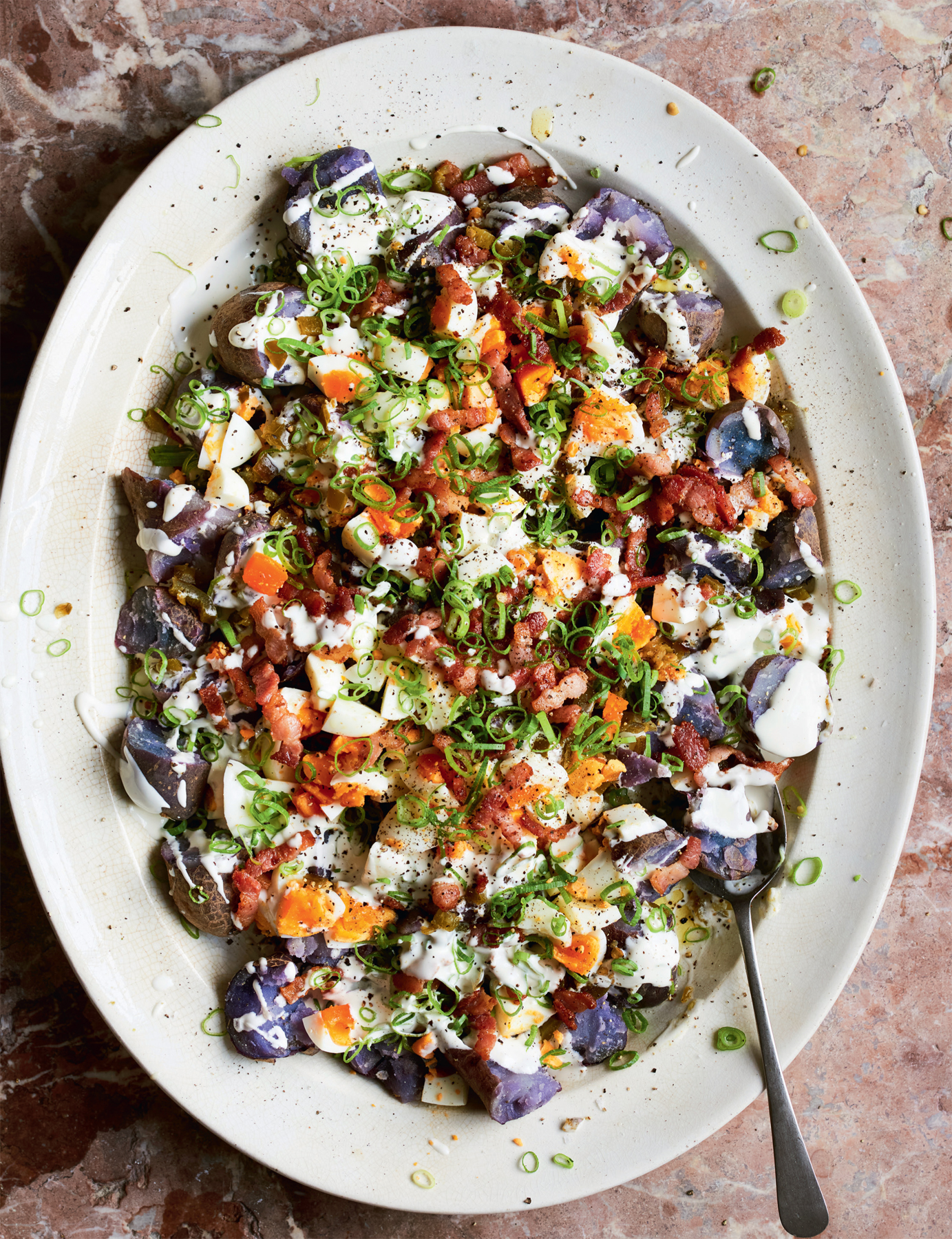 When everything is ready, it’s time to assemble the salad, beginning with the potatoes. Pull them apart into bite-sized pieces (I think it looks nicer than cutting them with a knife, and the rough edges hold the dressing better) and lay them out on a large plate or platter. Spoon the dressing over the potatoes and sprinkle half of the spring onions on top. Peel and roughly chop the eggs and sprinkle them in an even layer over the potatoes, followed by the bacon, the jalapeños and the rest of the spring onions. I like to sprinkle over a little smoked salt or celery salt if I have some to hand.