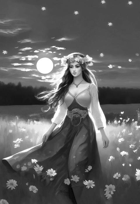 Гладит свет Ягине волос,Серебрит у платья пояс.Золотистые сапожки,Что скрывали её ножки,Оставляли сзади крошкиНа протоптанной дорожке —То ли лунного сапфира,То ль подарки ювелираВ виде золотых монетокДа сверкающих пайеток [19].По веленью волшебстваИзумруд ей пал в глаза.Травы собраны в руке,Да такие же – в венке.Лунным светом смущена,Улыбается она.Вот пришли они к колодцу,Из него взлетает солнце —Бог Ярило на коне,Враз Иван забыл о сне.Просит у него Ягиня,У Велесового сына,Дать культуры яровой,Чтоб Ивану взять домой,А не то народ погибнет.Бог Ярило зёрна сыплет.Падает зерно в лукошко [20]Да за пазуху [21] немножко.Ваня сразу ободрилсяИ Яриле поклонился.Тот коня ногой пришпорил,Ночь Ярило с земли гонит.Шёл Иван к избе с Ягиней.Урожаю быть отныне.Серый волк бежал за ними,На болоте выпи выли.А когда шагали полем,Повстречался бык им вскоре.Попросил тот бык зерна,Ваня дал ему сполна.В доме кот на печке грелся,И мурлыкал, и вертелся,Да к Ягине кот ластился,На коленки к ней ложился…На вторую ночь опятьНе велит Ягиня спать.Надо им идти по лесуИ тяжёлую по весуПринести с собою воду,Чтоб наполнить ей колоду [22].Лунный свет ложится низко,Вот колодец уже близко.Волк следит из-за куста,Филин кружит, как вчера.Воду нужно для отвара,Но забыта в доме тара.Трудная стоит задача,Выполнить её – удача.Мудрый взгляд Ягини строгий:«Не смотри, Иван, под ноги,А в колодец полезай,Мне, Иван, ты доверяй!»Что ж, полез Иван туда,Воду черпнул в рукава.Когда вылез из колодца,То вода с него не льётся.Смотрит Ваня на себя:Рукава как два ведра,Вся рубаха изменилась,Словно в камень превратилась,Стала будто из свинца,Тянет вниз к земле юнца.Еле нёс Иван те «вёдра»,Но Ягине верил твёрдо.А Ягиня рядом шлаДа траву опять рвала,Приговаривала что-то,Ваня же слабел от пота.Не привык Иван к такому,Вот пришли они до дому.Вылил всё, что нёс, в колоду,Лунный лик подул на воду.В чане [23] булькает вода,Растворяется трава.Кот, мурлыча, помогал,Чтоб готовился отвар.В нём щепотка бузины —Лечит хвори у спины,Зверобой – от ревматизма,И мелькает в чане пижма,Растворяет кипятокСтебли трав для слабых ног.Дева заговор читалаДа с Луной совет держала.Так под взглядами ЛуныТравы заговорены.