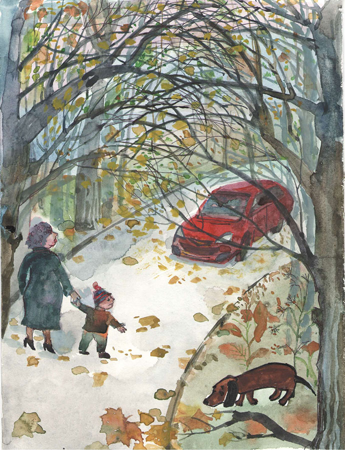 Подняв озябшую лапу, пёс замер, читая по дуновениям ветра, как по нотам. Когда есть хоть слабый ветерок, всегда знаешь что и где. Уловив знакомый запах, Рудик оглянулся. Близорукий, он еле разглядел вдалеке две чёрно-белые фигурки: они удалялись всё дальше и дальше. Он хотел бежать за ними, догнать. Но не смог: мимо проносились машины, оглушая неприятным рыком и противным запахом.