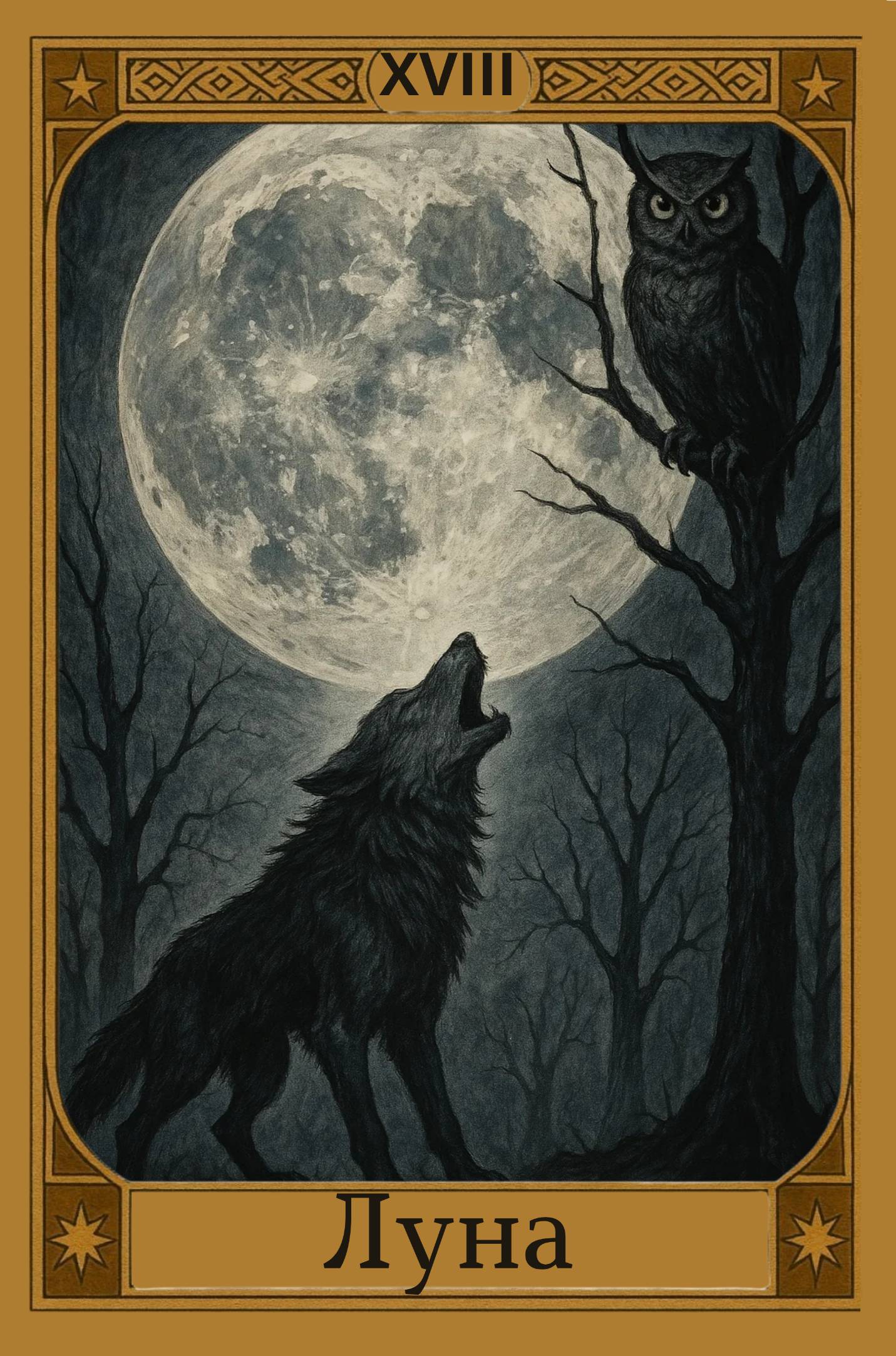 Громадная круглая Луна, с тщательно прорисованными на ней кратерами, занимала большую часть карты. Второй по величине фигурой был волк со вздыбленной шерстью, неприкаянно воющий на небесную красавицу. От воя его клонились к земле мрачные мёртвые деревья, давно забывшие о том, как приятно наряжаться по весне в изумрудную свежую крону. И только самое высокое дерево стояло прямо, презрительно наблюдая за своими податливыми собратьями. На вершине его сидела пугающего вида сова, которая круглыми как блюдца глазами, не стесняясь, а может, и насмехаясь, заглядывала в самую глубину души Марфы Захаровны.