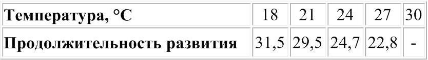 – свыше 400 яиц. При 22°С эти показатели сокращаются соответственно до 38 и 360, а при 27°С – до 18 дней и 135 яиц.