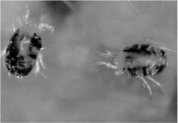 Взрослая самка клеща широкоовальной формы, длина тела 0,4…0,5 мм, четыре пары ног. Окраска тела варьируется в зависимости от состояния кормового растения и времени года. При размножении на предпочитаемых кормовых растениях (роза, калла) самки летних поколений зеленовато-желтого цвета с темными пятнами по бокам, на хризантеме и гвоздике (менее благоприятных кормовых растениях) – желтовато-бурого (рисунок 2). Самцы значительно меньше (0,3 мм) самок, с удлиненным, резко суженным к заднему концу телом.