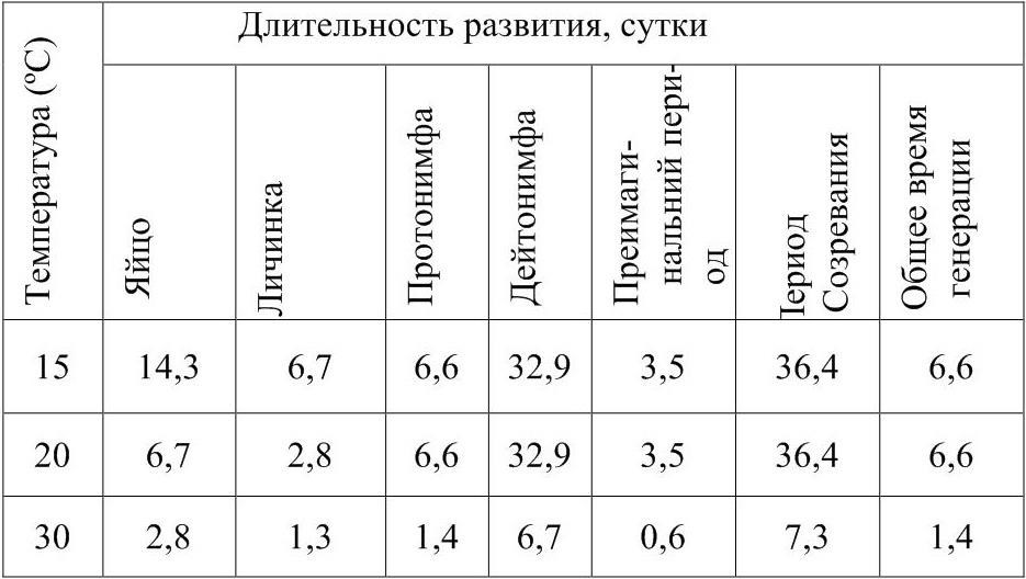 Таблица 1 – Длительность преимагинального развития тепличной белокрылки в зависимости от температуры (по Burnett, 1949)