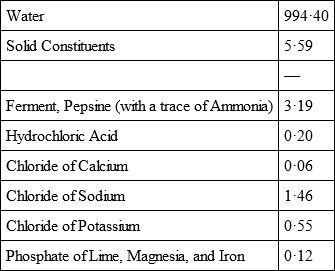 Food when it is going through the process of digestion is reduced to a pulp by the solvent properties of the gastric juice, which are due to the presence of the animal matter or pepsine, and the hydrochloric acid; neither of these two constituents can digest separately, they must be together; and they must be in that proportion as we have before us in the preceding table; to act as complete disintegrators and solvents.