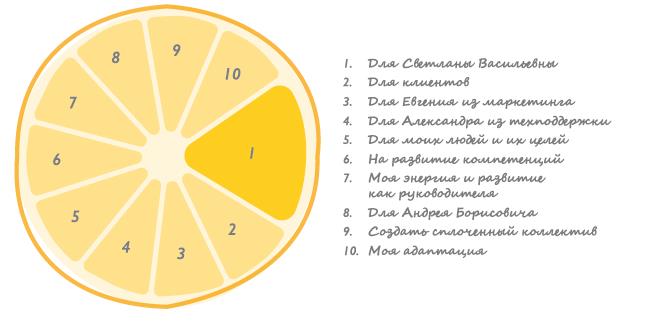 А когда все начали по очереди выступать с докладами по целям, я со своим апельсином почувствовал себя звездой. Хорошо, что я в прошлый раз с Татьяной про стейкхолдеры поговорил и с ребятами, Евгением и Александром, заранее все обсудил. Они меня так поддерживали, что возникло чувство, будто я наши общие цели проговариваю. Очень прикольно. Даже Светлана Васильевна с интересом слушала и отметила: «Хорошо, что цели затрагивают не только твой продукт, что есть и кроссфункциональные цели, нам всем надо это на заметку взять».
