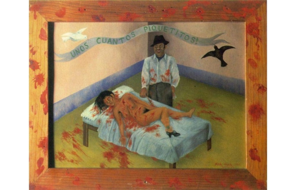 Одна из самых известных картин на эту тему – «Всего несколько уколов». Кровавая постель и мужчина с ножом, стоящий над распростертым телом Фриды. Она правда говорила, что картина написана по мотивам одного преступления, о котором она прочитала в газетах, но уж больно на картине лица знакомые.
