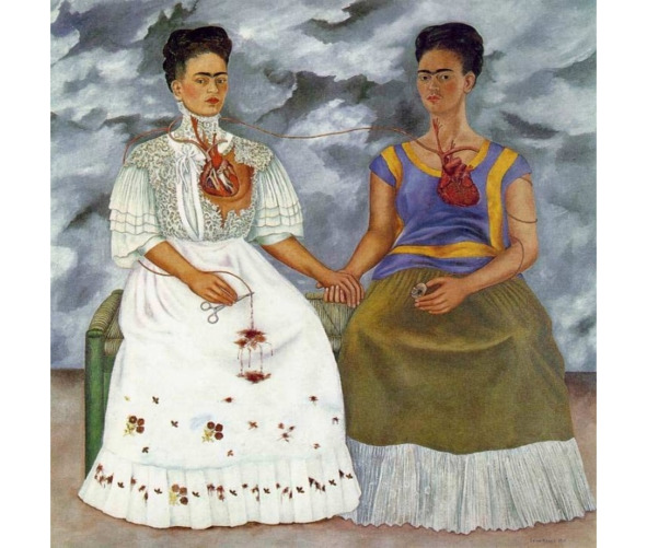 Ни на одном автопортрете Фрида не улыбается: серьезное, даже скорбное лицо, сросшиеся густые брови, чуть заметные черные усики над плотно сжатыми чувственными губами. Идея ее картин зашифрована в деталях, фоне, фигурах, появляющихся рядом с Фридой. Или рядом с двумя Фридами.
