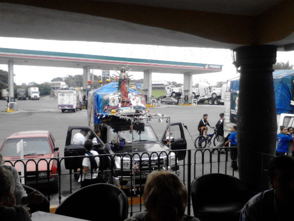 В данном случае группа, которую я запечатлел на этом фото, где-то на заправке, факел не несут, а везут на велосипеде. XXI век на дворе, вообще-то. А вообще, та благодарность с которой мексиканцы, да и вообще мезоамериканцы, относятся к Деве Мари Гваделупской, по мимо языческой версии имеет еще и большую общечеловеческую.