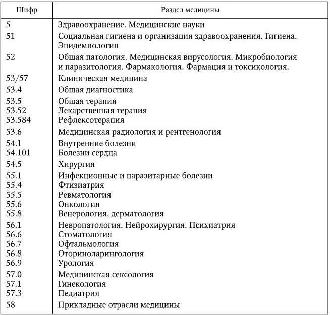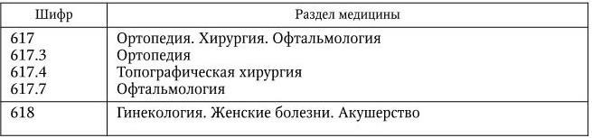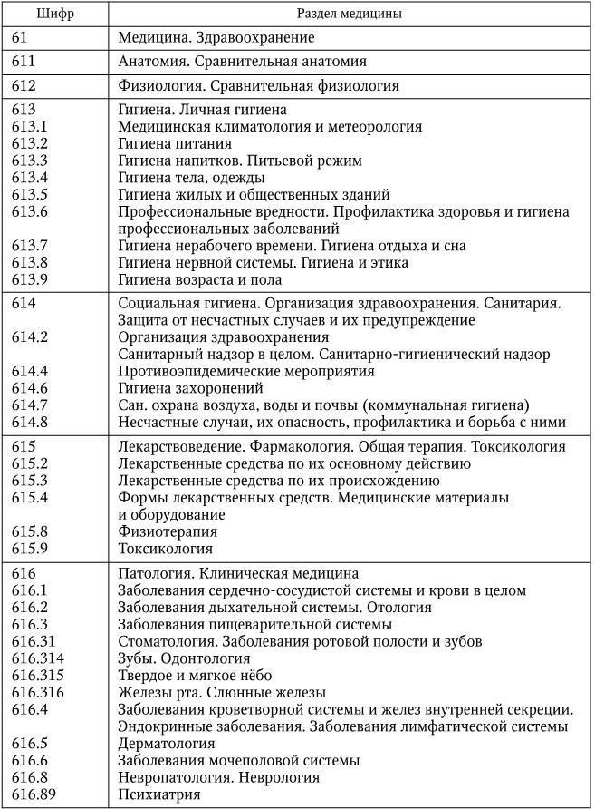 Для систематизации литературы используется и Библиотечнобиблиографическая классификация (ББК). Некоторые шифры ББК находятся в табл. 6, а относящиеся к медицине – в табл. 7.