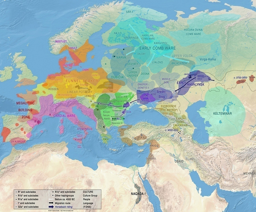 Среднестоговская культура и хвалынская культура V тыс. до н. э., обозначены фиолетовым цв.