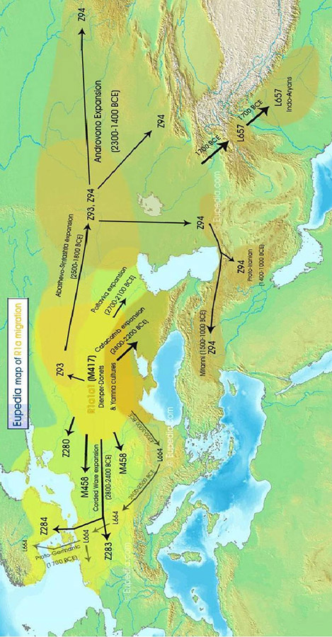 Карта миграций индоевропейцев приблизительно с 4000 по 1000 год до н. э.