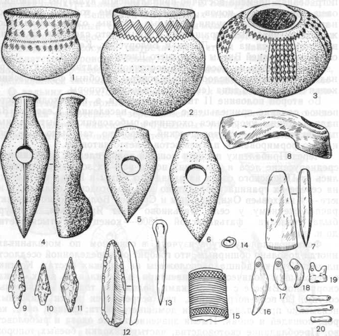 1 – сосуд московско-клязминского типа; 2 – сосуд верхневолжского типа; 3 – сосуд средневолжского типа; 4 – ладьевидный каменный топор; 5—6 – каменные топоры; 7 – клиновидный каменный топор; 8 – вислообушный бронзовый топор; 9—11 – каменные стрелы; 12 – кремневое орудие; 13 – костяная проколка; 14 – медное колечко; 15 – браслет; 16—20 – украшения