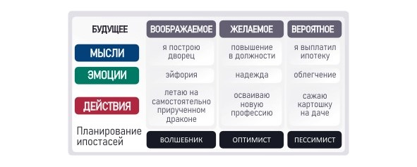 ВООБРАЖАЕМОЕ будущее отражает обдумывание; используйте вопросы с глаголами «желать», «хотеть», «стремиться» без ограничения полета фантазии.