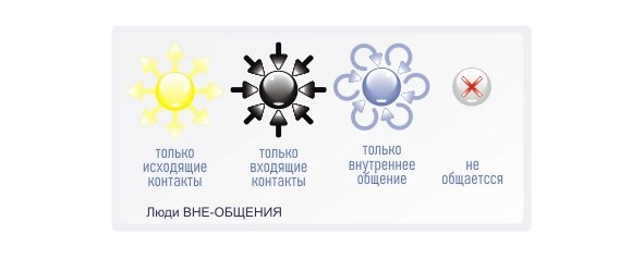 Промоделируйте свое пространство общения. Определите, к какому типу общенцев/необщенцев относятся ваши контакты. Определите свой тип, посмотрите, насколько велика вероятность успешного общения или общения вообще.