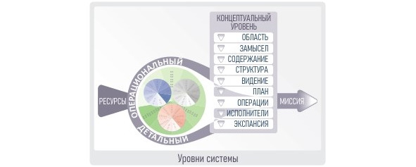 – концептуальным уровнем системы (идеи, планы, миссия, ценности, ресурсы);