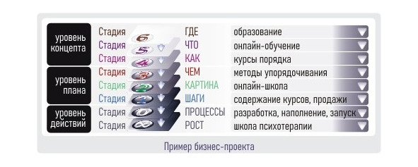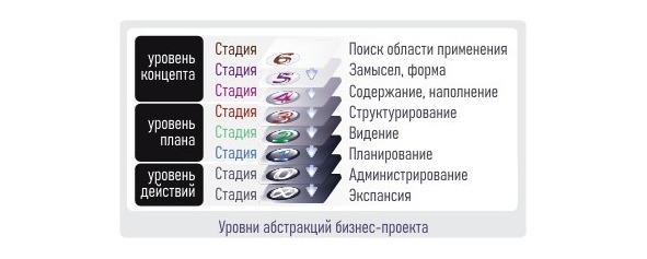 Бизнес-проект содержит аналогичные уровни с разницей, что цель смещается с поисковой или научной (учебной) на деятельностный уровень с развитием.