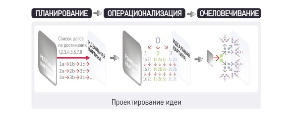 Если вы «видите» реальность проекта, можете увидеть проект изнутри от первого лица, абстрагируйтесь и посмотрите на проект снаружи. Опишите картины реальности: существующую и желаемую. Вы сформулировали портрет потребителя, область распространения продукта, содержание продукта, инвентаризировали ресурсы, установили связи, исходя из того, что есть на сегодняшний день. Введите фактор времени. Сформулируйте (представьте, опишите) реальность проекта в будущем времени, когда вы достигнете желаемого состояния. Опишите идеал проекта, составьте КАРТИНУ будущего. Опишите потребителя, область распространения, содержание продукта, ресурсы и связи через год (пять лет).