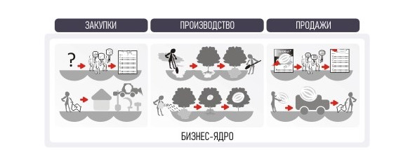 Смыслообразующая деятельность компании представляет разработку и предоставление продуктов и услуг. В производственной компании базовые, ядерные процессы – это закупки, производство (выращивание), сбыт (реализация).
